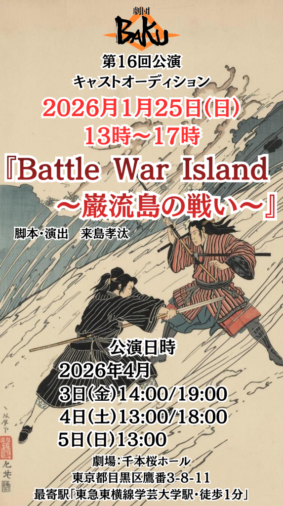 2026年で創立5周年を迎えます。これまで関わって下さった方々に心より感謝申し上げます。そしてこの度、劇団BAKU16回公演を打つ運びとなり、それに伴いまして、ご出演頂けるキャスト様と出会いたいと思いキャストオーディションを開催させていただきます。